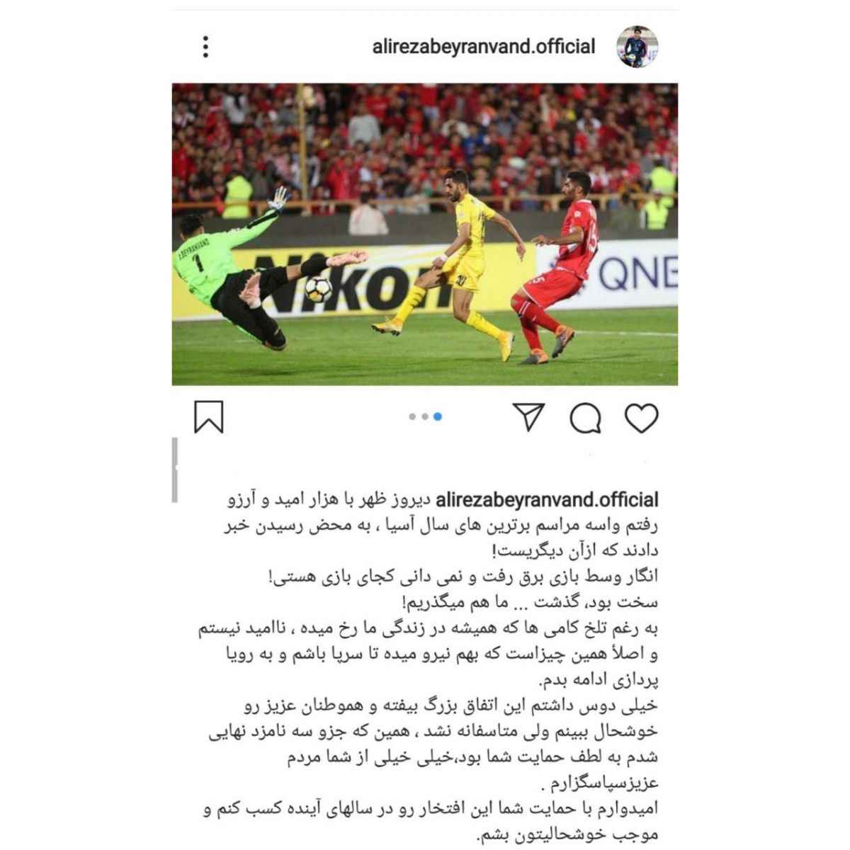 علیرضا بیرانوند دروازه بان تیم ملی فوتبال ایران و باشگاه پرسپولیس پس از حضور در مراسم برترین‌های سال آسیا پستی را در اینستاگرام منتشر کرد.