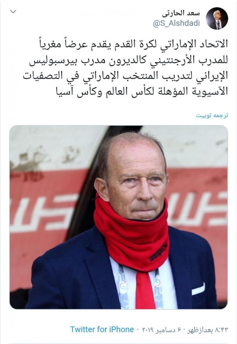 به گزارش اسلامیک اسپرت، سعد الحارثی روزنامهنگار مشهور اهل عربستان و از مقامات سابق کنفدراسیون فوتبال آسیا از پیشنهاد جذاب اماراتی ها به کالدرون، سرمربی تیم فوتبال پرسپولیس برای هدایت تیم ملی این کشور در جام جهانی و جام ملتهای آسیا خبر داد.